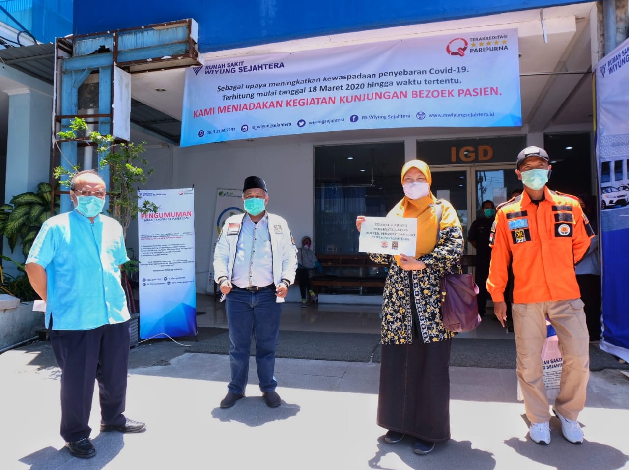 Di RS Wiyung Sejahtera, sumbangan masker diterima langsung Direktur RS dr. Eko Wahyu Agustin, MM dan Ketua Satgas Covid-19 dr. Irma Widyastuti beserta seluruh jajaran manajemen RS. Dalam kesempatan tersebut, diceritakan kondisi RS Wiyung Sejahtera yang kemarin menerima pasien suspect dan harus ditangani karena RS rujukan penuh. Disebabkan minimnya APD, maka mereka menggunakan jas hujan dan sepatu boot. Hal ini tentu beresiko tinggi. Keluhan soal minimnya APD ini menjadi hal utama yang disampaikan para tenaga medis. “Stoknya langka. Dan harganya tinggi. Sementara kami yang bukan RS rujukan corona belum mendapatkan bantuan dari Pemerintah. Padahal kami juga beresiko ketika menerima pasien,” ujar dr. Eko Wahyu Agustin.