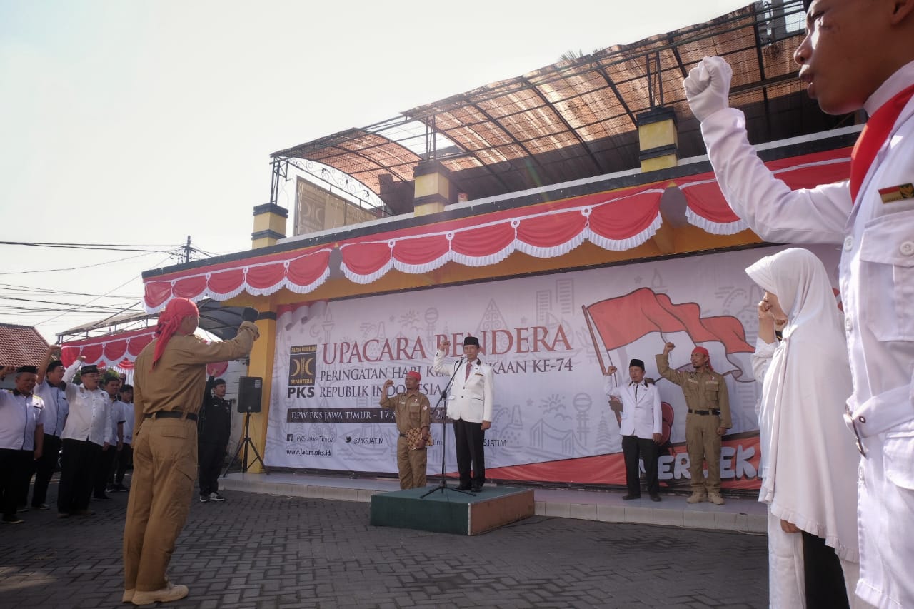 SURABAYA (17/8) Dewan Pengurus Wilayah Partai Keadilan Sejahtera (DPW PKS) Jawa Timur melaksanakan Upacara Bendera Peringatan Kemerdekaan ke-74 Republik Indonesia di Kantor DPW PKS Jatim, Jalan Gayungsari Barat X no.33 Surabaya. Bertindak selaku Inspektur Upacara Ketua Umum DPW PKS Jatim Arif Hari Setiawan.